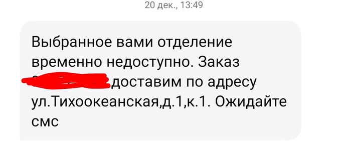 Соответственно сделал заказ в маркете от зеленого банка, предлагающего самую привлекательную цену товара и доставки, и стал ждать собственно доставки. 13.12 был сделан заказ, доставка оформлена до ПВЗ OZON/Boxberry в Осиновой роще по ул. Приозеское шоссе. Дата доставки была назначена на 20.12. В тот день, утром мне приходит смс от Боксберри, я ее мельком глянул, но не вчитался, подумал что заказ прибыл в ПВЗ. После работы по пути домой зашел в ПВЗ, достал телефон, чтобы посмотреть номер заказа и понял, что смс была совсем о другом, а именно о том, что отделение временно недоступно (несмотря на том, что я в нем стою, и оно вполне доступно), и что заказ будет доставлен по адресу ул. Тихоокеанская д. 1, к. 1. Глянув по карте, где это вообще находится, я понял, что мне до него 8 километров езды на такси или личном транспорте, или с пересадкой на неизвестный мне автобус неизвестно где.