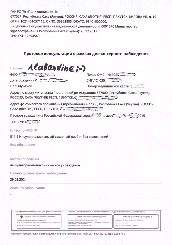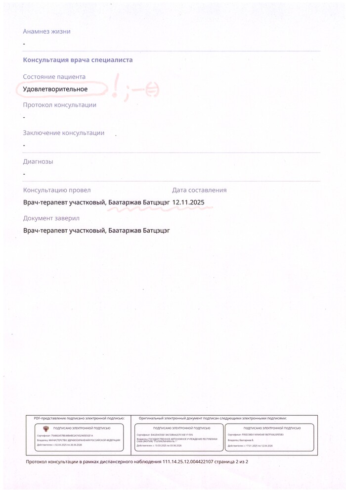 Да и всё бы хорошо, но только в поликлинике за последние 10 лет первый, он же последний и единственный раз я был 29.03.2024 г. А тут 12.11.2025, ФИО врача и электронная подпись.