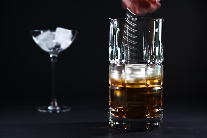 Закидываем лед в смесительный стакан, вращаем - охлаждаем, сливаем воду.