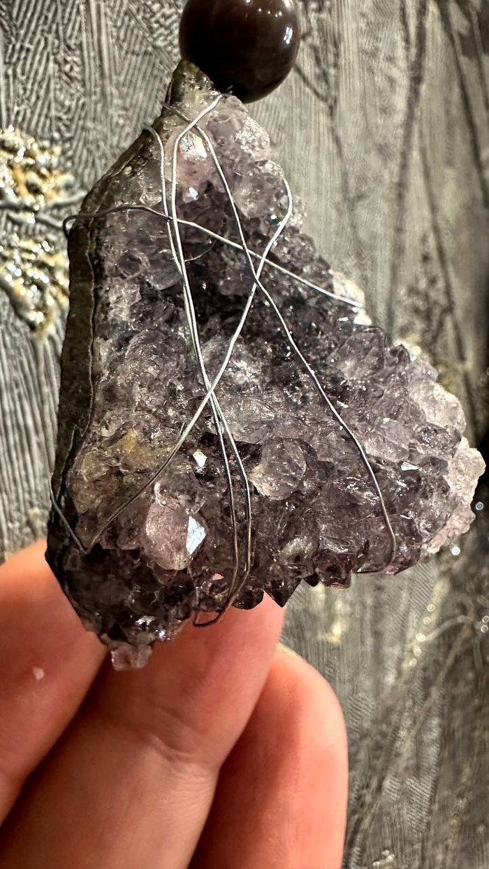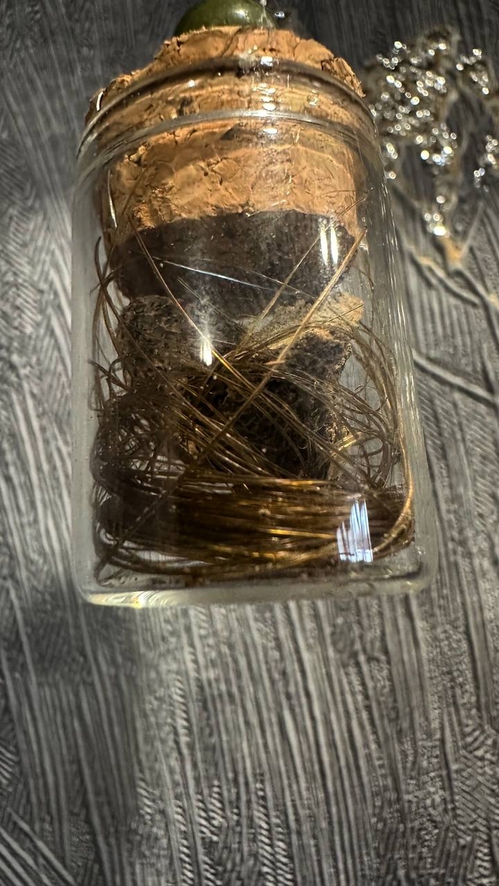 Для украшения использовались череп ворона,увесистая друза аметиста, пара фрагментов костей плейстоценовых животных, вымерших около 12 тысяч лет назад, и самое главное, это колба, в которой лежат фрагменты кости мамонта и его шерсть.