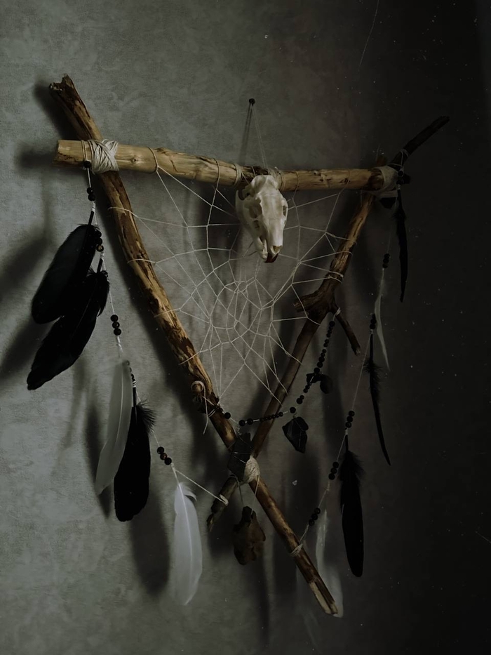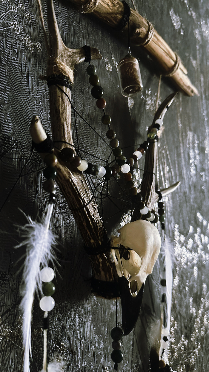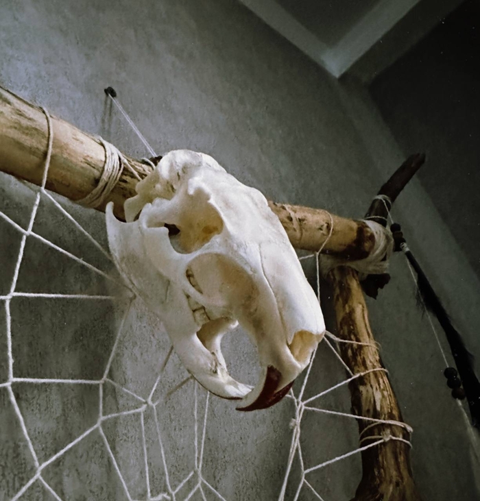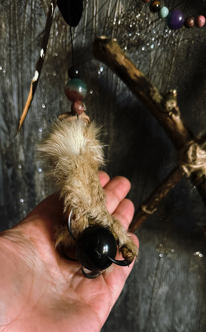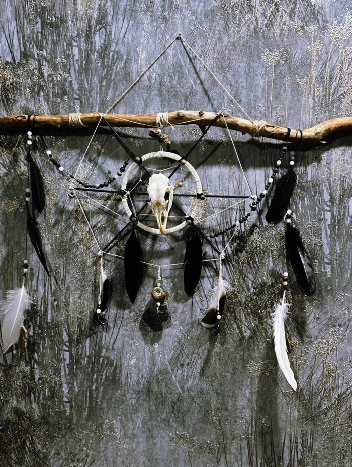 Сделала вот такой ловец из черепа косули, лапы неясыти, окаменелой кости, а так же камней обсидиана в лапке совы и апатита в кости.