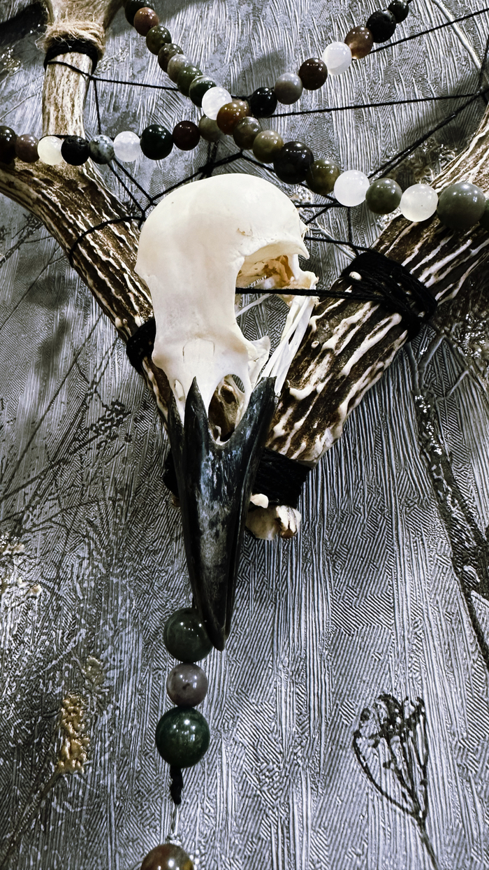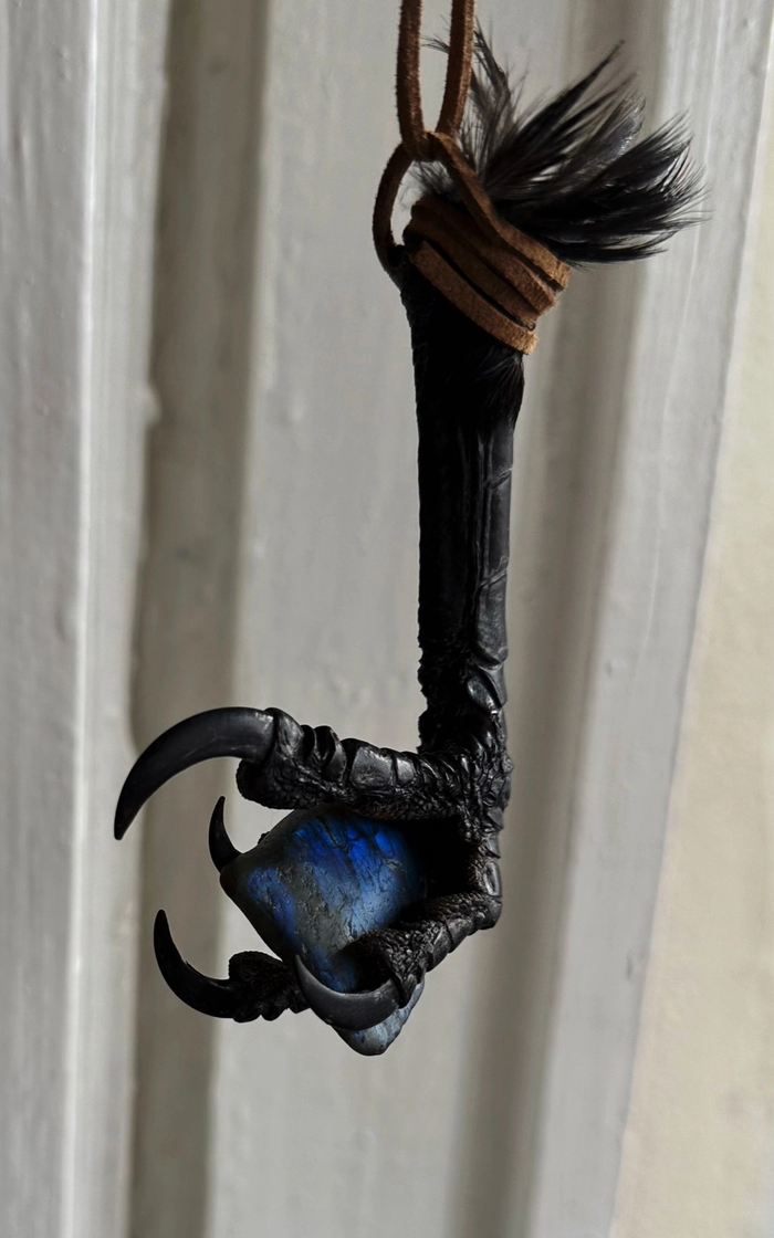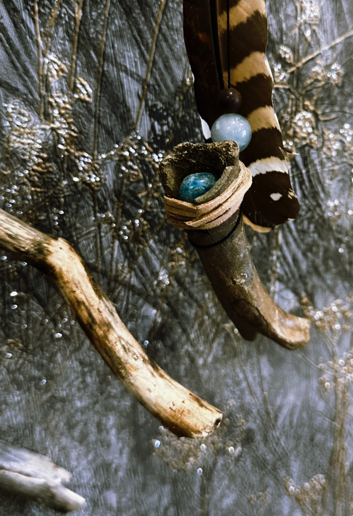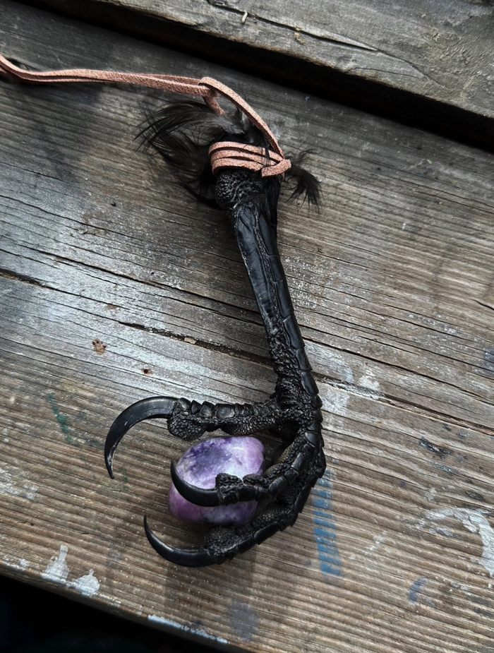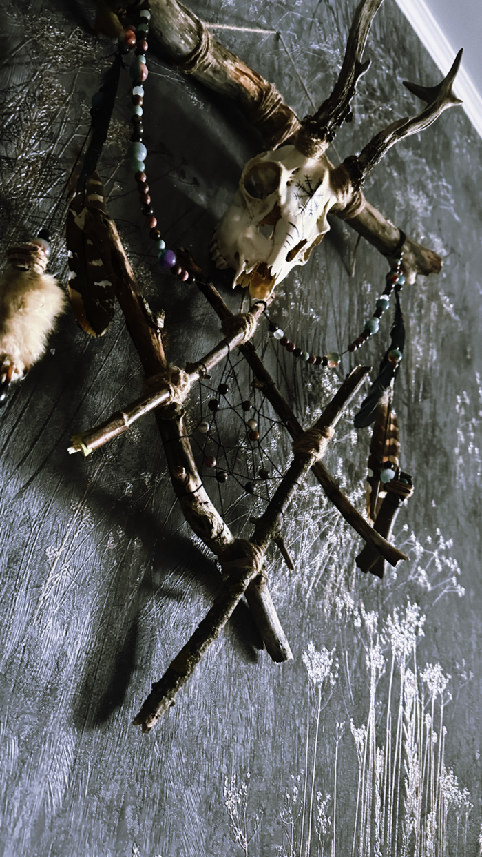 Сделала вот такой ловец из черепа косули, лапы неясыти, окаменелой кости, а так же камней обсидиана в лапке совы и апатита в кости.