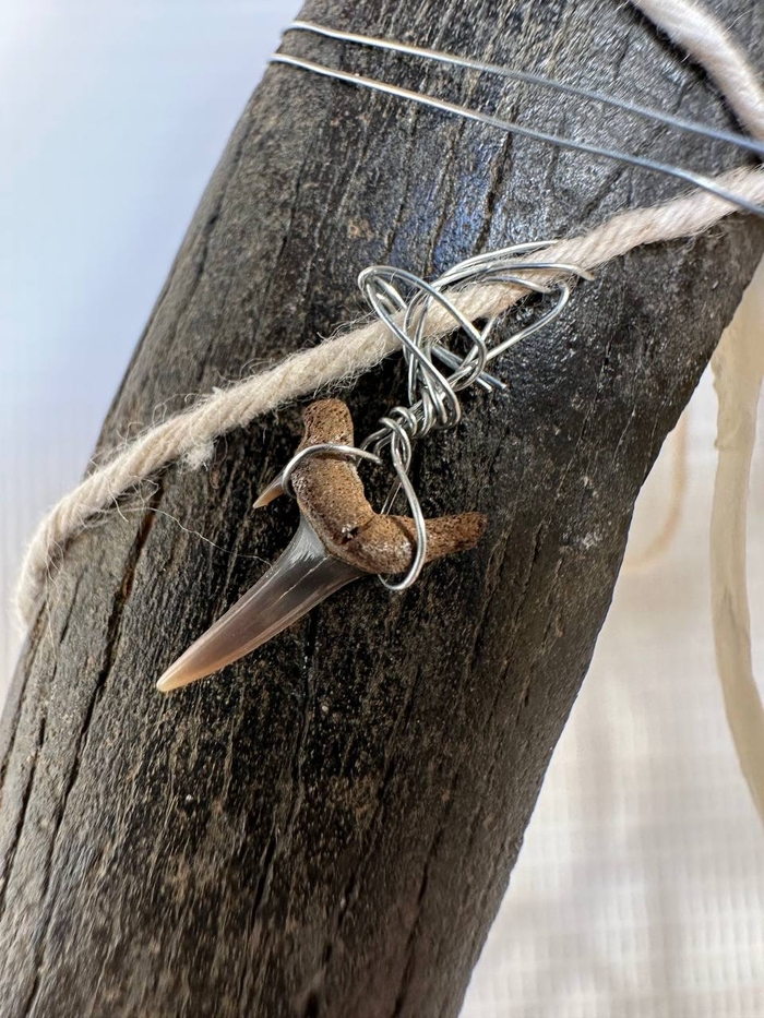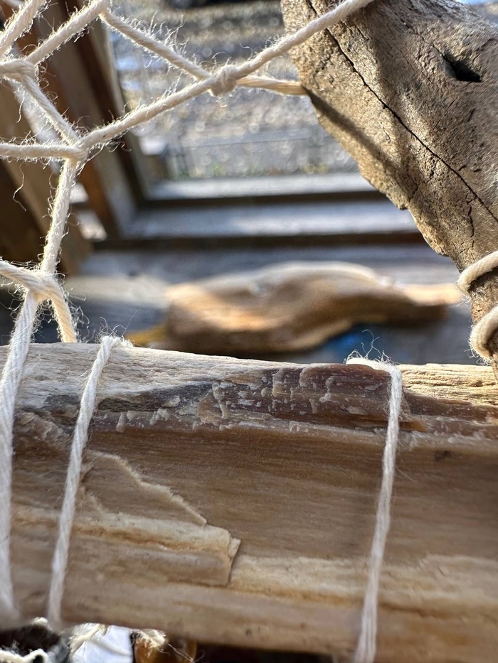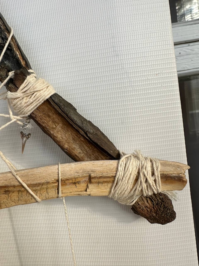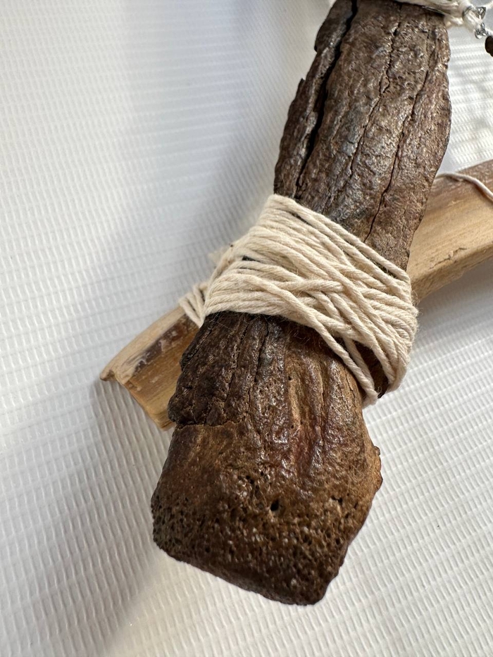 Боковые грани ловца сделаны из костей степного бизона, древней лошади и пещерного волка, возраст костей примерно 15-20 тысяч лет. Нижняя грань треугольника - окаменелое хвойное дерево ,возрастом около девяти миллионов лет, но с хорошо сохранившейся текстурой. В качестве декора я использовала окаменевшие зубы акулы эостриатоламии (eostriatolamia) , приблизительный возраст 90 млн лет, найденные в Саратовской области, два кусочка окаменелой кости степного бизона и череп птицы нашего времени.