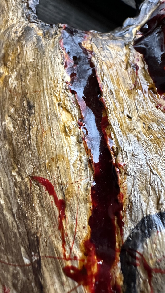 Затем я нанесла первый слой лака с оттенком «сосна». После высыхания приступила к разукрашиванию, использовала акриловую краску и темные тени, которые просто набирала на палец и размазывала. В качестве крови я использовала покупную искусственную кровь, но если у вас такой нет , то вы можете взять немного лака, добавить в него красной краски, перемешать, и по грамму добавлять синюю краску до желаемого кровавого цвета. Этой массой я заполнила все, что чертила по мокрой шпатлевке.