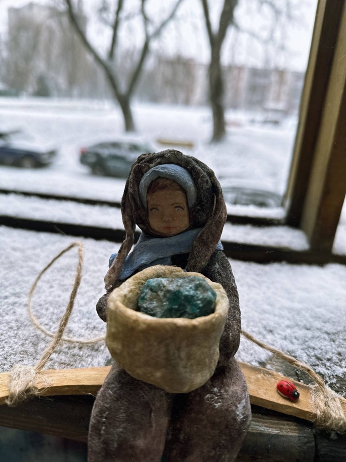 На самом деле такого рода творчеством я занималась впервые, и вот какой результат получился. Яша это оберег для дома, жердь на которой он сидит - окаменевшее хвойное дерево, возраст которому более десяти миллионов лет. У многих народов окаменевшее дерево выступает в роли сильнейшего защитного инструмента. В мешочке у Яши - камень Апатит. Апатит - камень компаньон, который не терпи смену хозяина.