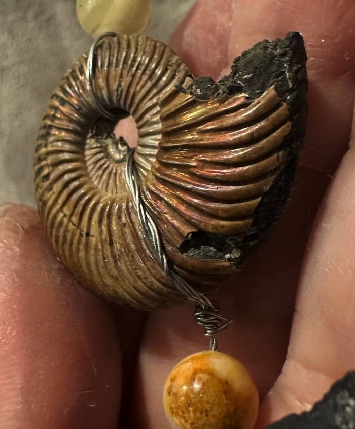В этот раз украсила его прекрасным аммонитом - древним моллюском юрского периода. Примерный возраст 160 млн лет. А так же пластинами с отпечатками растений, в частности папоротником, и листом вымершего хвойного кордаита, примерный возраст 380 млн лет. Отпечатки с двух сторон. Использовала и зубы вымершей акулы Archaeolamna sp.. меловой период, возраст примерно 90 млн лет и кусочки костей древней лошади , плейстоценовая эпоха, около 12 тыс лет. В центра череп птицы наших дней.