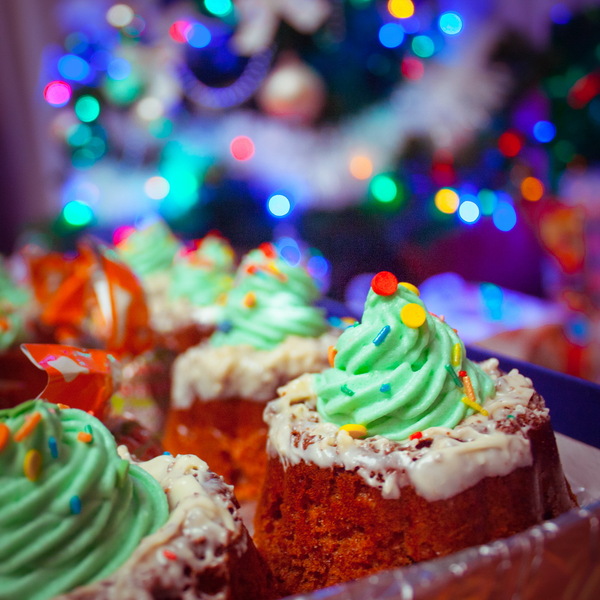 5) Сливки взбиваем с пудрой, по ходу дела немного добавляя зеленый краситель. После этого аккуратно ложкой добавляем маскарпоне, перемешиваем и перекладываем в кондитерский мешок. Высаживаем на пирожные зеленые "ёлочки" и украшаем их кондитерской посыпкой :)