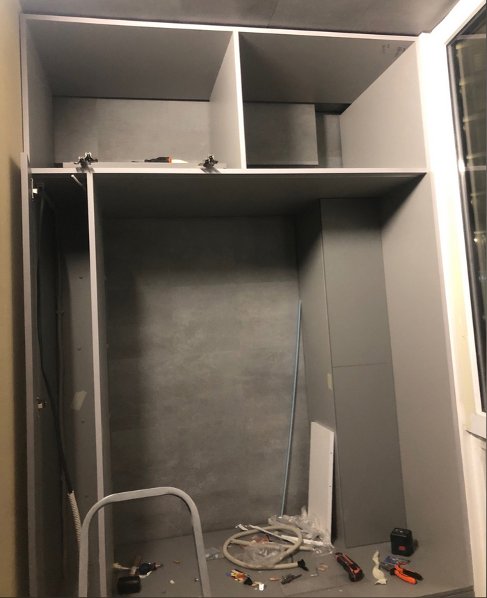 •Самое сложное - это воткнуть антресоль. Верхушку антресоли с перегородками и стенками собирал на полу, а дальше поднимал и ставил в присадочные отверстия (ну в те которые совпадали) дна антресоли, соединил на мебельные уголки с заглушками. Тут без помощи не обойтись. Кстати кабель в гофре закреплял на клипсы.