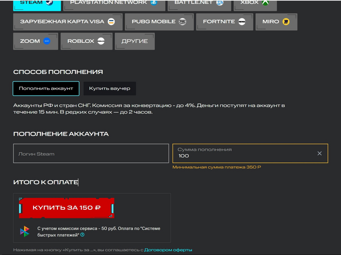 -Пополнение по логину от 100Rub, комиссия от 20 до 16%, можно скостить за счет промокодов, которых в сети полно.
