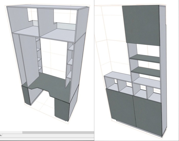 •Приступаем к процессу сборки. Я открыл программу pro100 и начал собирать используя проект как схему сборки, это удобно и наглядно, находим необходимую деталь по размеру и соединяем их друг с другом конфирматами. В некоторых местах соединения делал на уголки