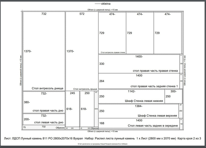 •После проектирования и сверки всех размеров, приступаем к раскрою. Переносим данные из pro100 в новый раскрой, выставляем размеры лдсп, размеры пилы и обрезку лдсп по кругу и жмем кнопку кроить. Сохраняем карту раскроя, тут же сохраняем список деталей с размерами и кромками. Еще раз проверяем все ли кромки указаны