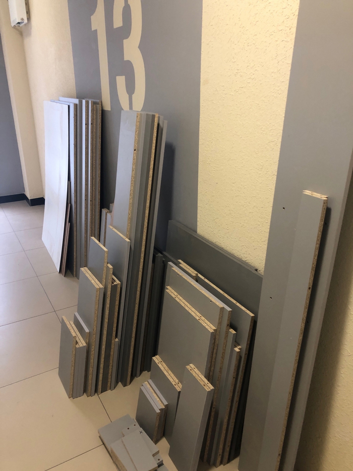 •Заказ распила. Теперь у вас есть вся необходимая документация для заказа распила Едем на распил, отдаем бумажки, оплачиваем и ждем готовности, в моем случае ждать пришлось две недели. Далее будем работать руками и чуть чуть головой) Спустя две недели, распил готов, заказываем доставку и поднимаем на этаж) На мою мебель потребовалось три листа серого цвета и один тёмно-серый