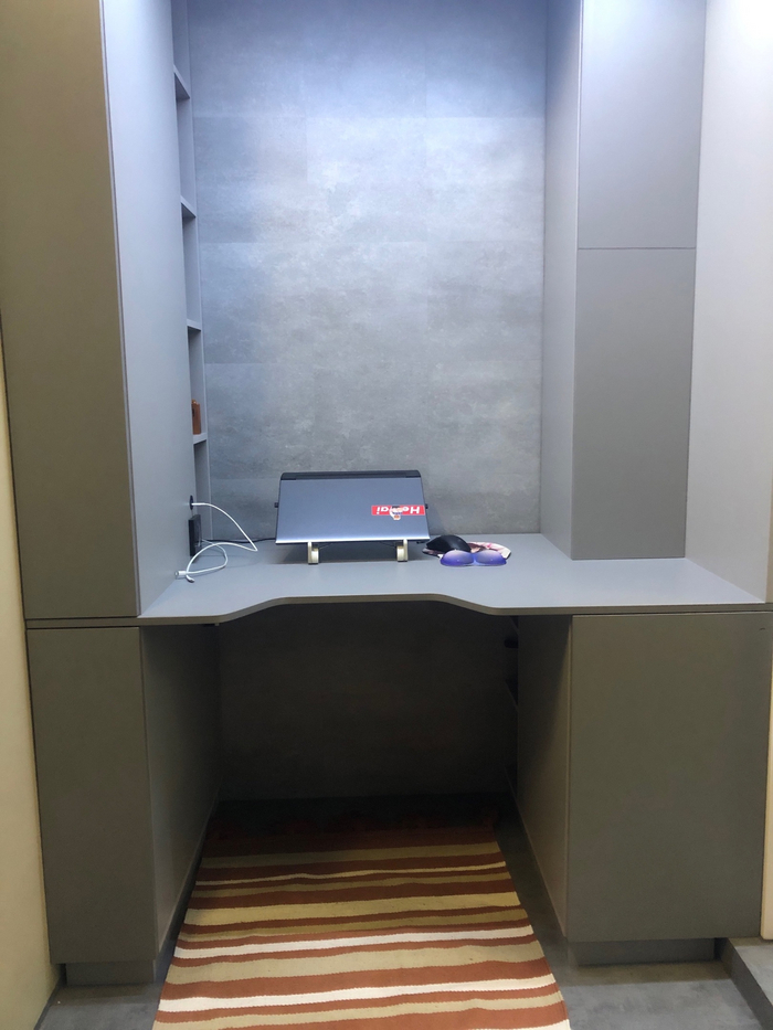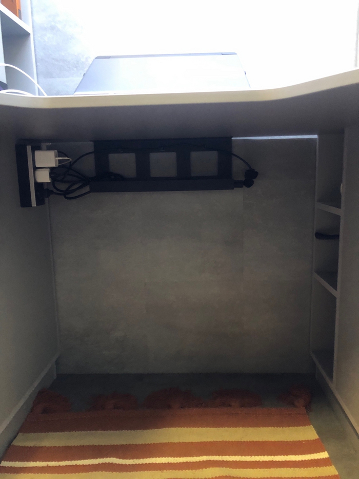 •Под столом накладная розетка и корзина для проводов и блока питания от ноутбука. Как будут проходить кабеля продумывал заранее, на этапе проектирования