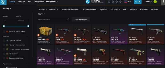 -Тоже биржа, также комиссия разнится, в среднем от 4% Из плюсов можно найти пополнение стим на небольшую сумму до 50 рубелей и кучу различных способов оплаты.