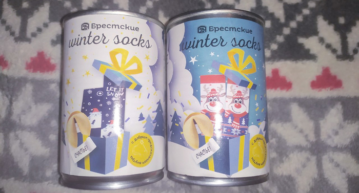 Немного отдышались, рассматриваем дальше. А что это за баночки? А это самые настоящие консервированные новогодние носки! XD Это не открывать, это на Новый год!