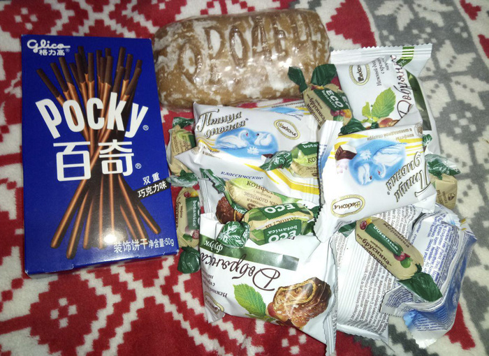 Также в подарке была целая куча разных вкуснейших конфеток, шоколадка и магнитик с символами города Бреста, гирлянда с прищепочкой-совой и т.д. Общий вид: