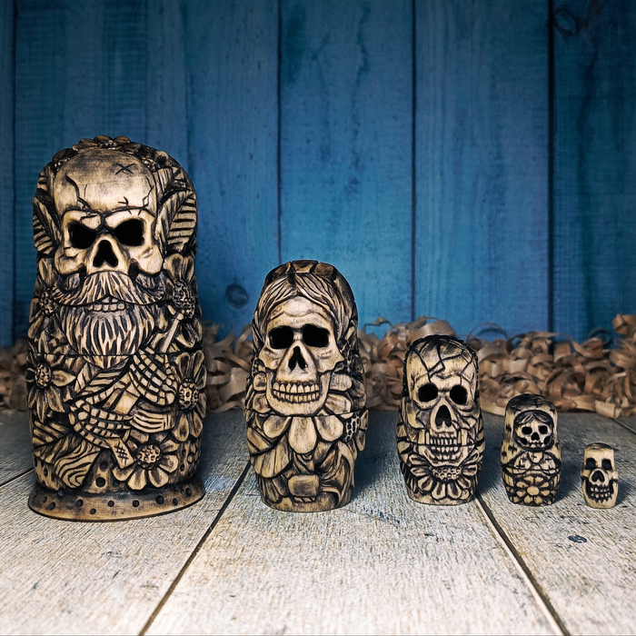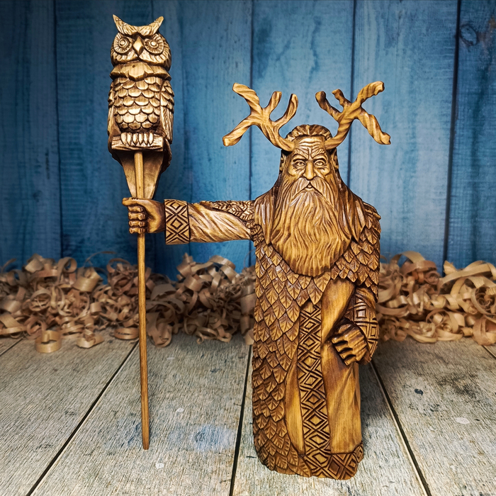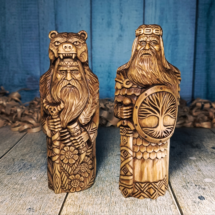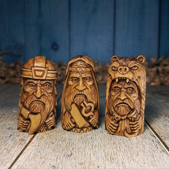 Три могущественных бога славянского пантеона — Сварог, Перун и Велес — вырезаны вручную из цельного массива берёзы с тонкой детализацией. Каждая фигурка обработана морилкой под эбеновое дерево, что придаёт тёплый, насыщенный оттенок, затем покрыта льняным маслом для защиты и крем-воском для мягкого блеска и приятной текстуры.