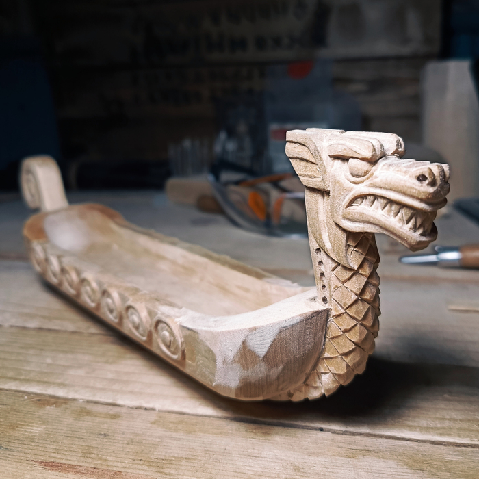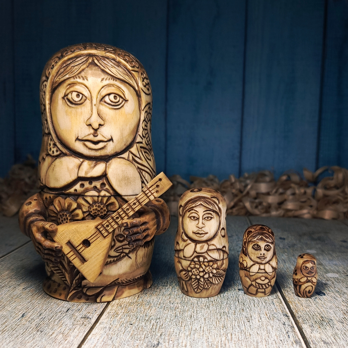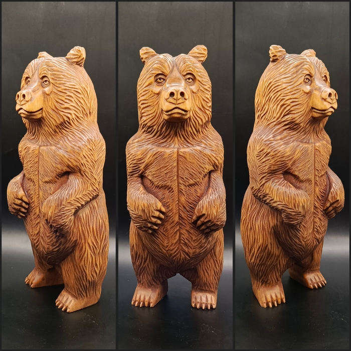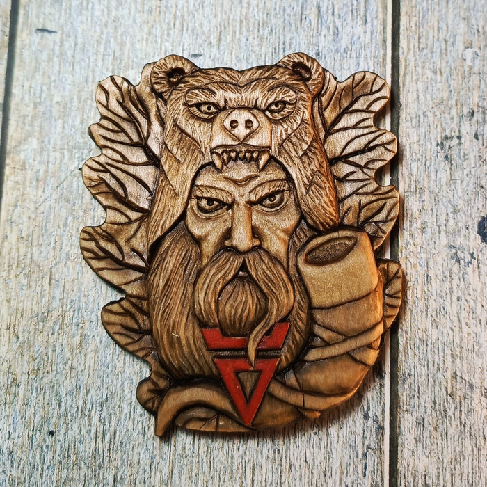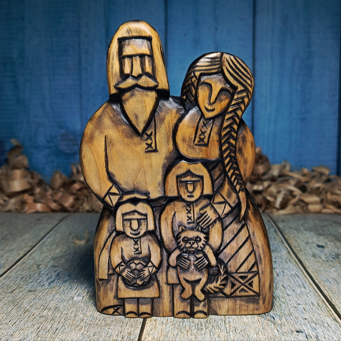 Фигурки установлены на еловой подставке, украшенной пирографией — выжженным узором леса и солнца, олицетворяющим гармонию природы. Подставка обработана так же, как и фигурки: морилкой, льняным маслом и воском, создавая единый стиль.