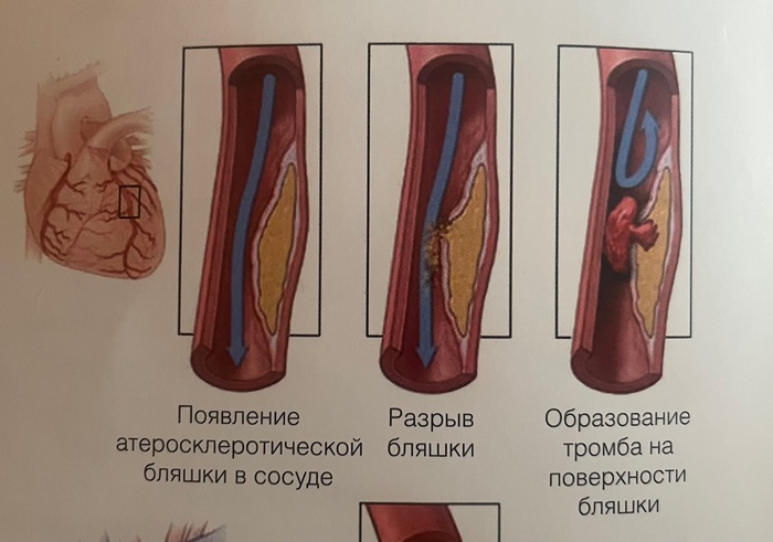 Что, собственно, произошло - из объяснения врача по фамилии Лобанов (чесслово). В сосуде была бляшка (холестерин и все такое). Из-за курения в сосудах появляются микроповреждения, в том числе и на бляшке. Дальше могло произойти что угодно - нервы, высокое давление, воспаление и тп. Бляшка порвалась и из нее вылилось в кровь что-то там ее бляшечное. Туда побежали тромбоциты, бороться с инородным телом, и образовали тромб. Тромб перекрыл артерию на 90%, кровь перестала поступать и нести живительный кислород, начался некроз тканей сердца. Появилась (и пока еще осталась) сердечная недостаточность.