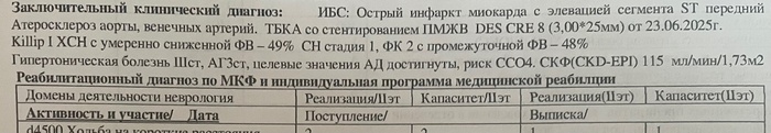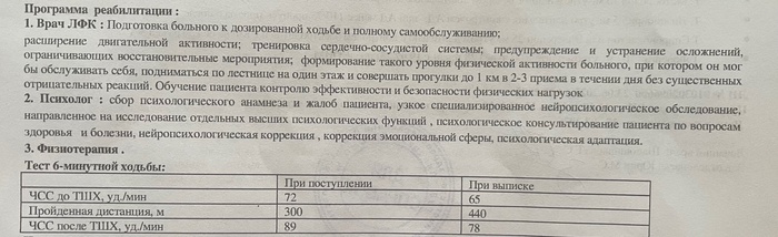 Этажом выше, в реабилитации, первое что мне сообщили: если стало плохо не садись на стул, не держись за стену, не иди в палату. Садись на пол, так все сразу поймут что тебе плохо и успеют тебя спасти. Сидя на стуле есть шанс просто умереть в тишине. Врач реабилитации, помимо таблеток, назначил ЛФК и лазерную терапию. К выписке я за один раз смог сразу друг за другом: пройти на беговой дорожке 10 минут, проехать на велотренажере 20 минут и пройти на эллипсе 5 минут. Не задыхаясь и с пульсом не выше 100. В больнице я провел 21 день.
