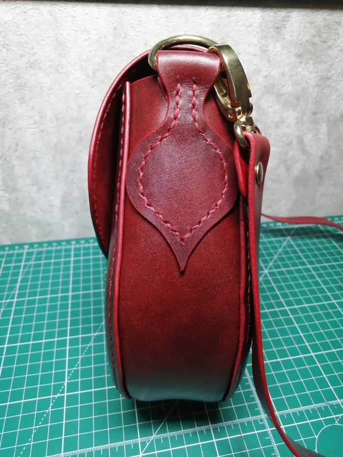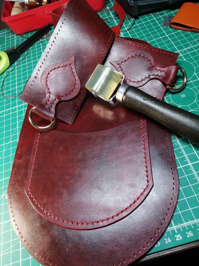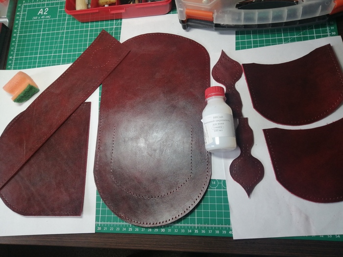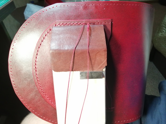 Кожа Грандж рубин 2.2-2.4 мм, кромки срезаны, торцы и бахтармы обработаны Токонолле. Нить плетёная плоская 0.8 мм, седельный шов. Пробойники с японским зубом, шаг 5 мм. Поверхность обработана BRCraft Finish, глянцевый. Фурнитура латунь. Выкройка из открытого доступа. Расход кожи - порядка 30 дм2.