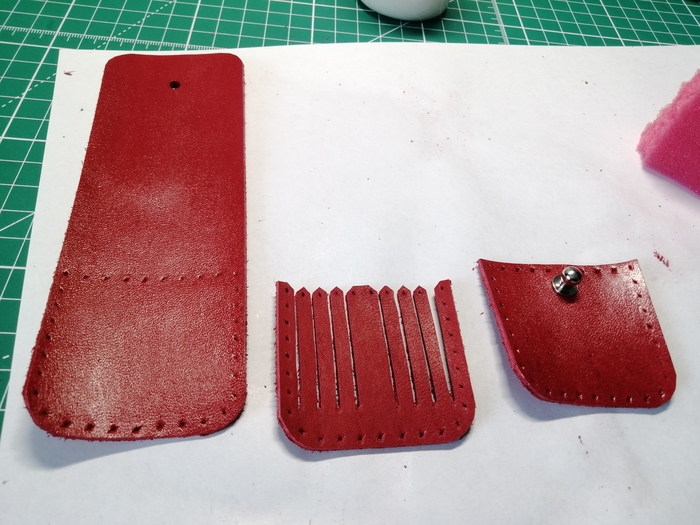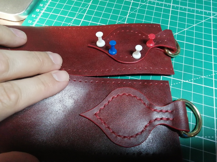 Прошил крепление ремня, ушки под полукольца. Обошёлся без клея, фиксировал кнопками.