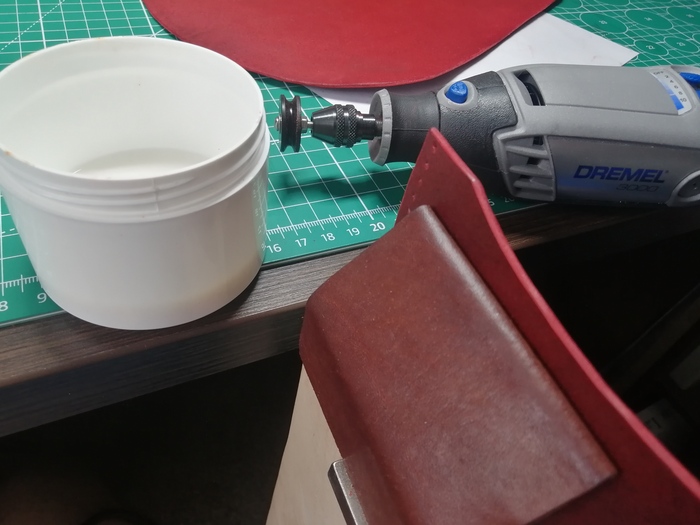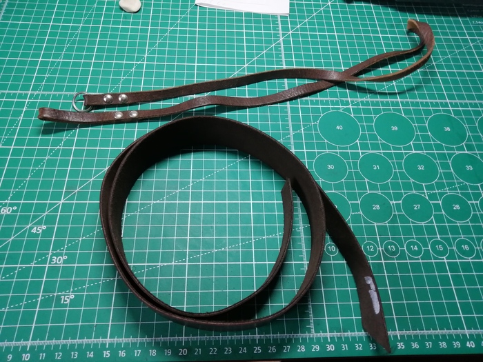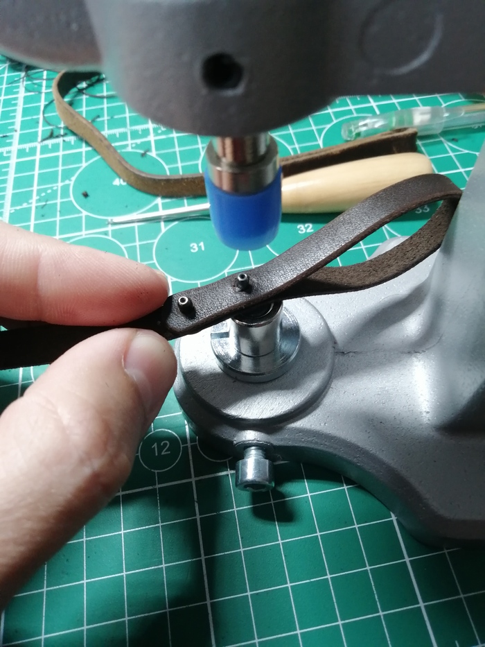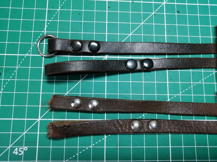 К сожалению, фото изготовления ремешка не делал. Там все по простому: вырезал, пробил отверстия, обработал лицо, изнанку и торцы, склепал с помощью пресса... На пару часов работы, в общем.