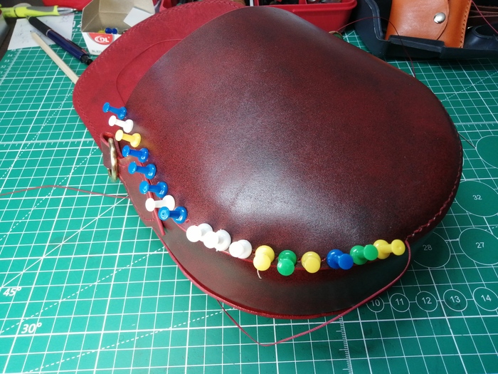 Стенки пришивались тяжело. Боковая стенка постоянно идёт на загиб по кругу, поэтому пришлось очень хорошо фиксировать большим количеством кнопок. Папу кнопок снял - пару кнопок прошил...