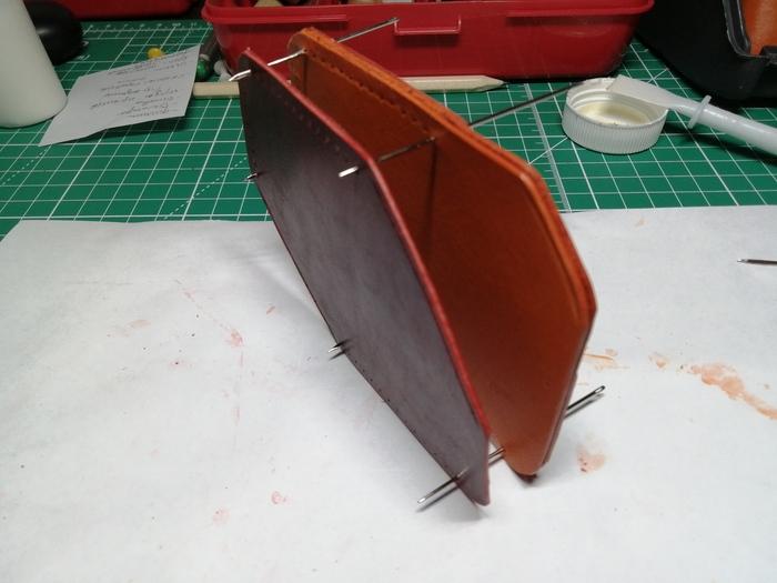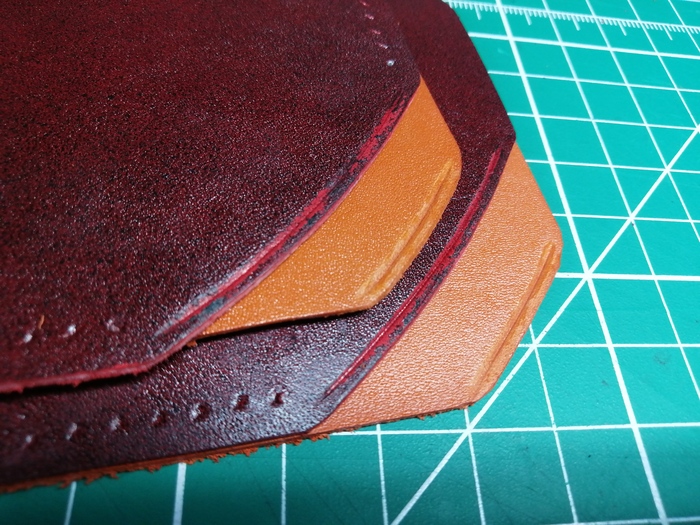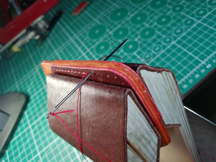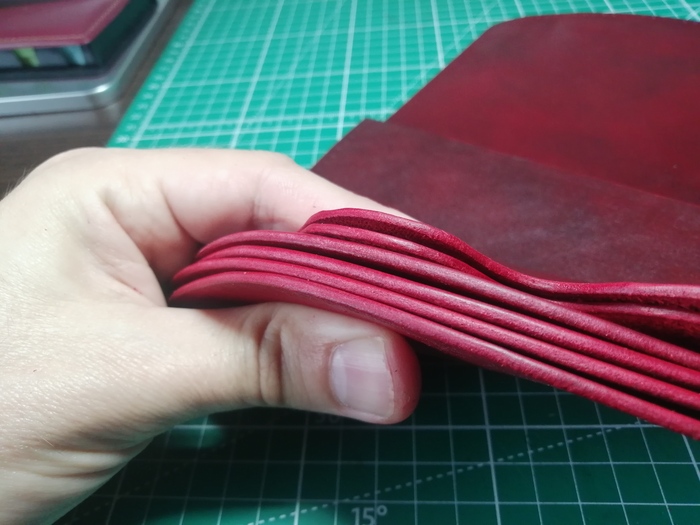 Пошил интересный кардхолдер. Биговка сняла верхний слой краски с красной кожи, получился интересный эффект. Оставил, будто так и было задумано.