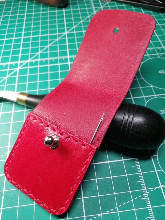 Игольница: кожа Краст 1.6 мм, Россия, пола. Кромки срезаны, урезы и бахтармы обработаны Токонолле. Выполнена биговка, 2 мм. Нить плетёная плоская 0,8 мм, седельный шов. Пробойники с японским зубом, шаг 5 мм. Поверхность обработана BRCraft Finish, глянцевый. Фурнитура никель. Выкройка из открытого доступа. Расход кожи - порядка 1,5 дм2.