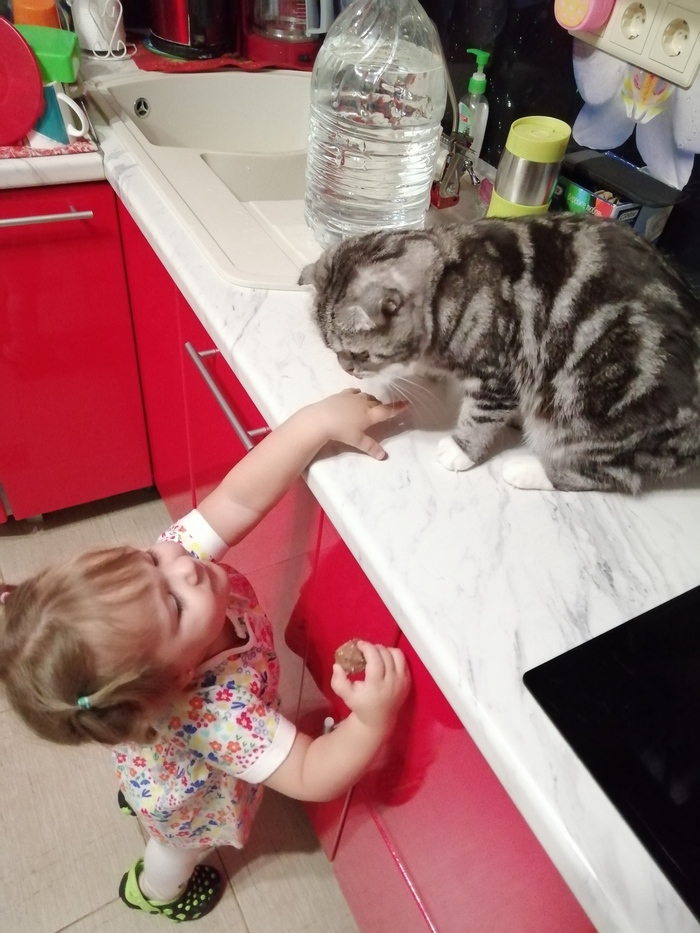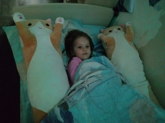 Доча с безымянными котами. Да, драные обои - её же рук дело.