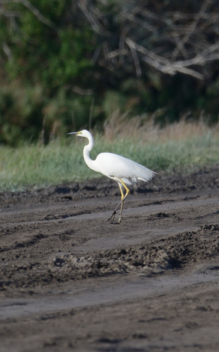 Большая белая цапля совсем обнаглела и села прямо на дорогу.