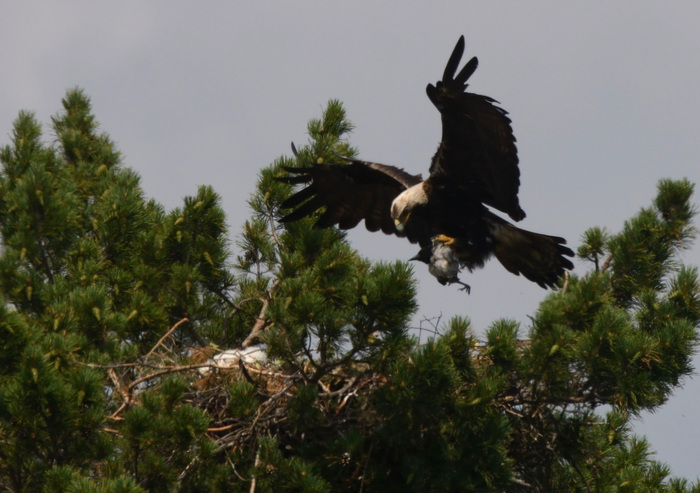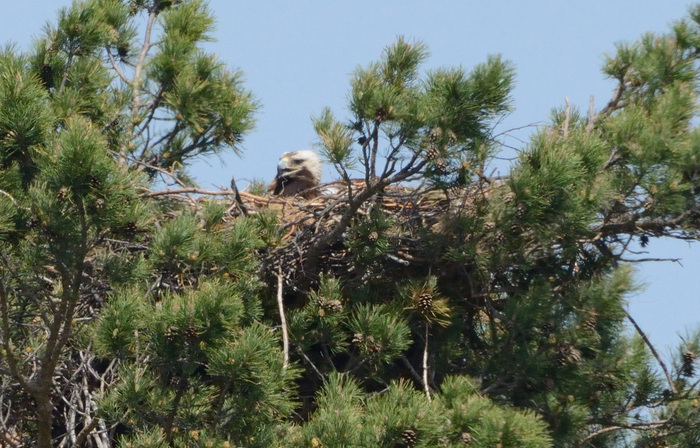 Могильник в итоге выглядел так. Это самка, насиживающая кладку на гнезде на вершине сосны. Подошли на 150 метров, сделали кадры и удалились в глубоком поклоне. Имперский орел, этикет нужно соблюдать. Видно, что птице жарко и что мы ей не нравимся. Поднимать на крыло, конечно же не стали, ума и опыта хватило у обоих.