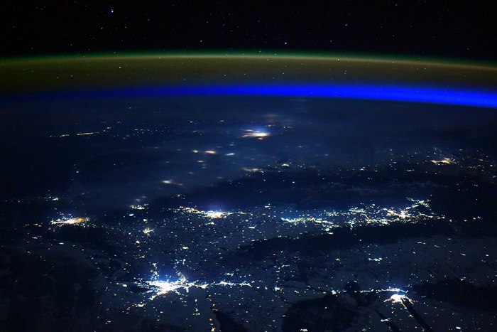 Слева снизу - Новосибирск, справа - Барнаул. Ещё левее ближе к центру в нижней трети кадра - Томск, правее его и правее и выше Новосибирска - Кемерово, сложная протяженная сеть справа от Кемерово - шахтерские города Кузбасса, самый яркий из них - Новокузнецк (он больше, чем Кемерово), самый далёкий правый из них - Междуреченск. Желтоватое свечение правее и выше за темной полосой - Абакан. Туманное яркое пятно выше центра - Красноярск.