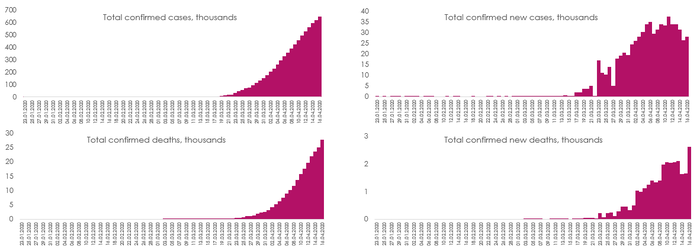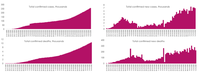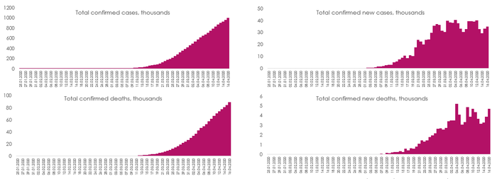 На графиках видно, что появление новых случаев заражения в Европе в целом замедлилось и вышло на плато (верхний правый график), так же, как и случаи новых смертей (нижний правый график). Плато по появлению новых больных обусловлено лишь одновременным влиянием двух разнонаправленных факторов – сокращением случаев в Италии и Испании и появлением новых «центров заражения», таких как Великобритания и Россия.