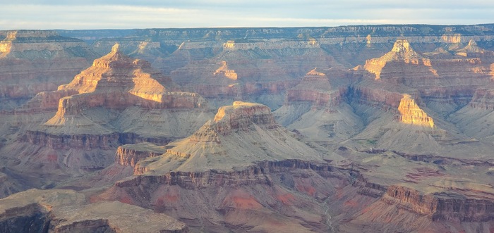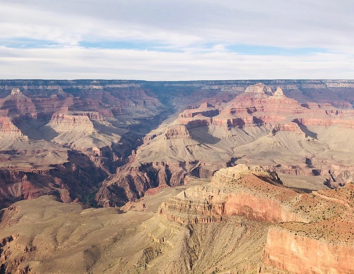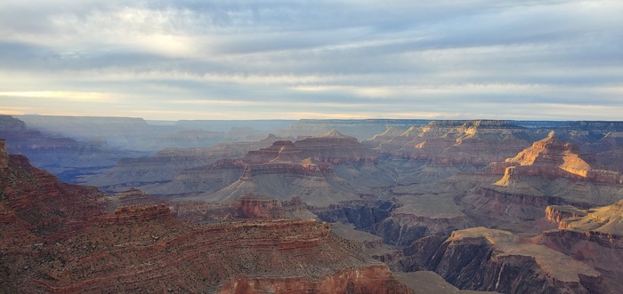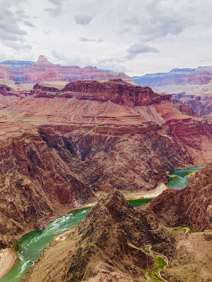 Вид на точке уже не может удивить, он просто лишний раз заставляет осознать собственную ничтожность. Поскольку обзорная точка находится на небольшом возвышении, а cо всех сторон пологие камни позволяют спуститься на пару метров ниже, можно увидеть все, что происходит вокруг. Вот вдалеке вьётся узкой ниткой тропа трейла Bright Angel, по которой медленно ползут точки-люди; километром ниже извивается зелёная река Колорадо, пенясь на отрогах белыми бурунами. На уровне глаз летают орлы и грифоны, очертания скал, гор, равнины теряются в дымке; невозможные масштабы подавляют. В какой-то момент я, клянусь, всплакнул от переизбытка эмоций, застряв на краю обрыва на долгие полчаса.