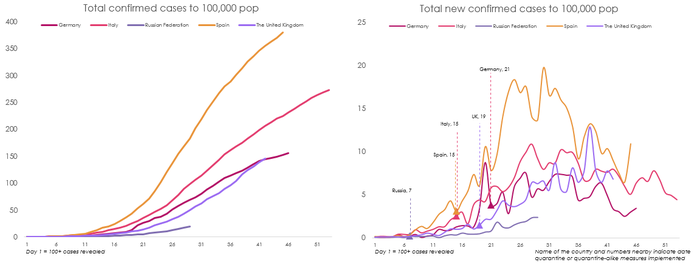 Количество новых случаев заражения на 100 000 человек населения сократилось практически втрое в Испании, вдвое – в Италии и показывает тенденцию к снижению в Германии. При этом видно, что все страны сравнительно поздно запустили карантинные механизмы – на 15, 19 и 21 дни. На этом фоне очень выигрышно смотрится Россия, объявив режим добровольной самоизоляции на седьмой день с даты выявления сотого случая заболевания.