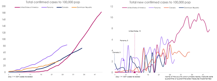 Логика раннего карантина в случае северной Америки сломалась, т.к. Канада, которая объявила об изоляции граждан еще до появления 100 больного, тем не менее не показывает тенденцию по сокращению новых случаев даже на исходе третьего десятка режима карантина, а в Панаме и того хуже – ситуация начала выходить из-под контроля.