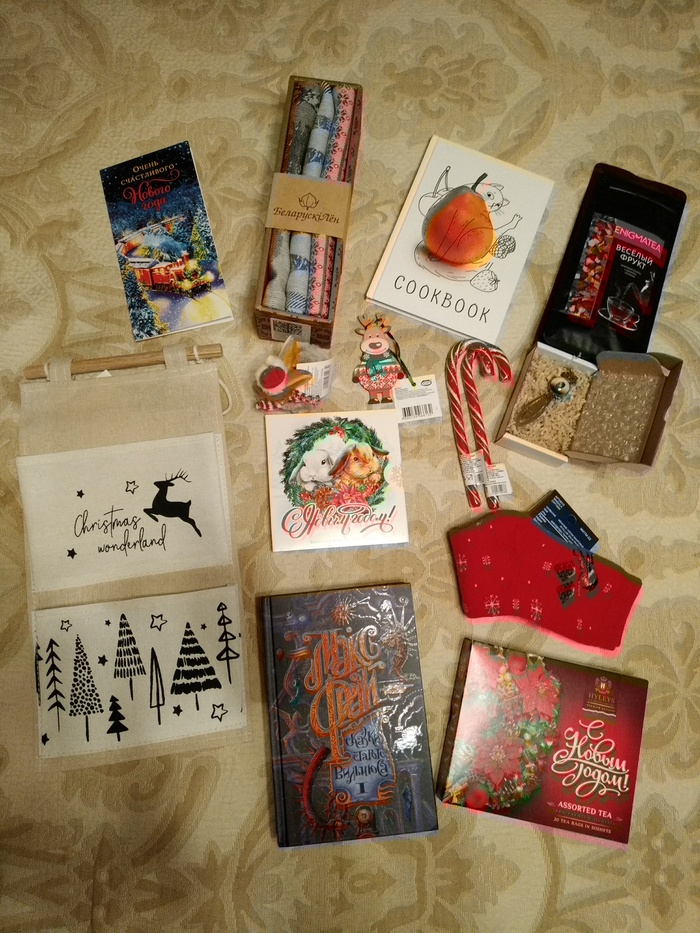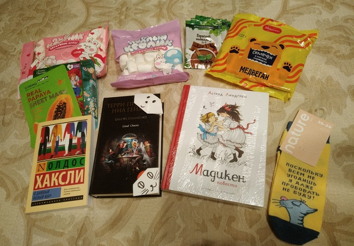 Вот и моя книжная посылочка пришла! Что обычно ждёшь от этого обмена? - книгу, закладку, может что-то вкусное. Но моя Снегурочка, Наталья, прошлась и по моим интересам, указанным в общей анкете. Как я узнала из письма, у нас абсолютно разные вкусы в книгах (и спасибо что не было Кинга, мне одного фильма в детстве хватило :) Но есть общее в жизни, поэтому ей захотелось порадовать меня и ей это удалось! Подарок я открывала ночью и так наверное и уснула с улыбкой на лице :)