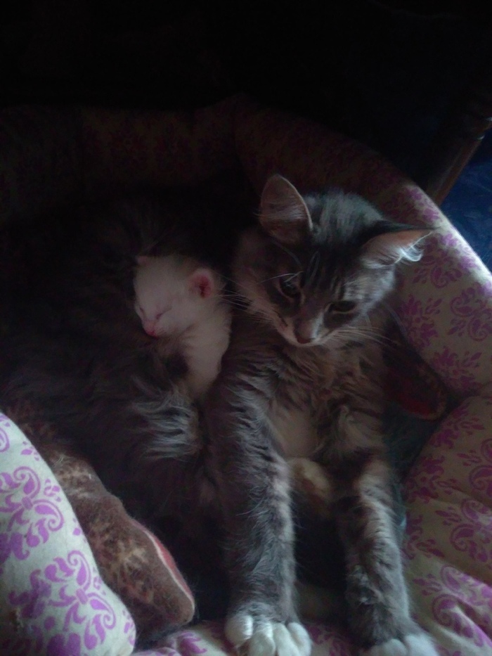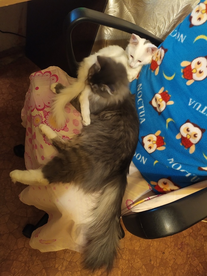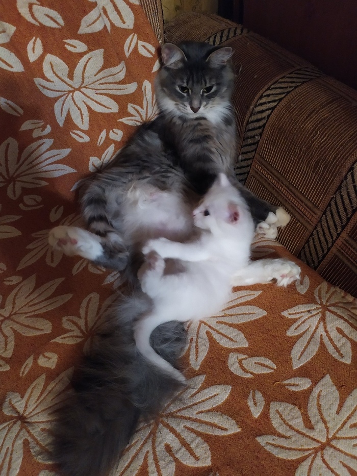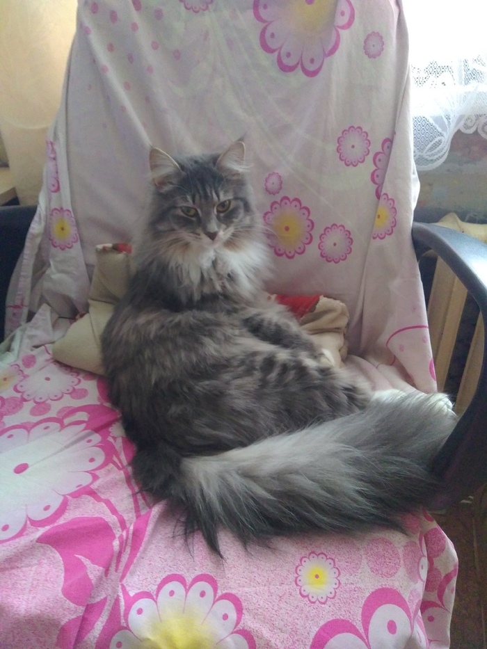 В июле 2018 года на даче у местной детворы забрали заморенную худую котейку (ей тогда было примерно 2 месяца).