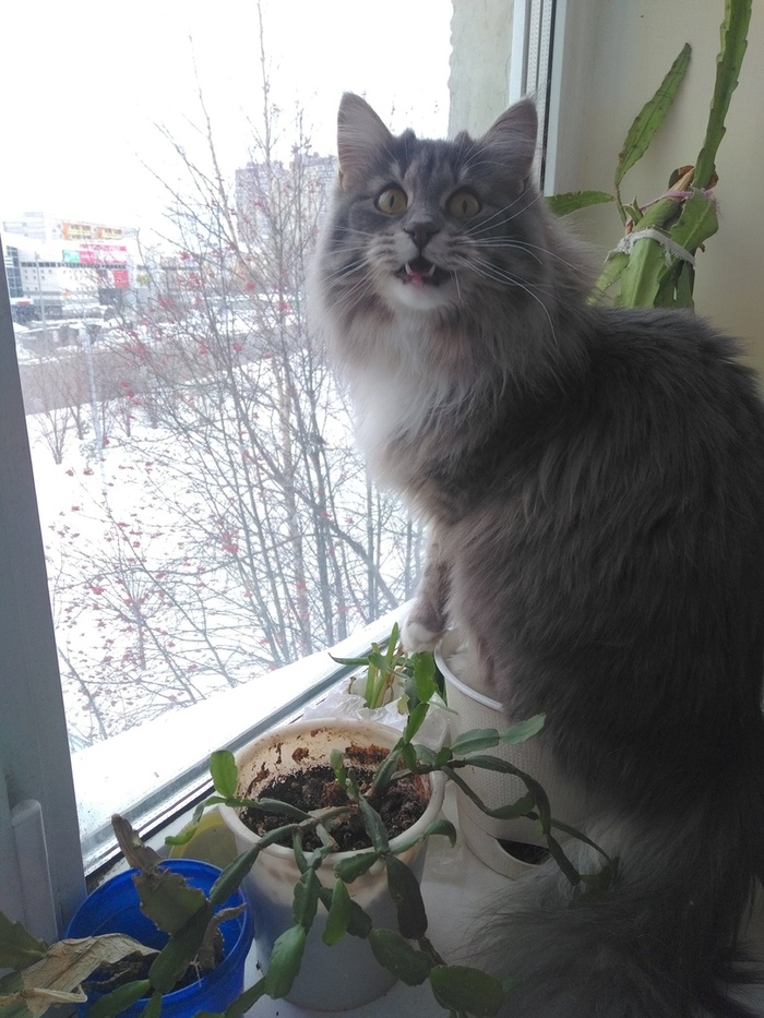 Софи - скромная мадам, которая редко мяукает, но очень ласковая. Любит часами сидеть на окне и пребывать в шоке от летающей за ним еды.