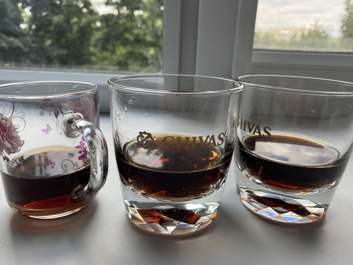 Горит костер. Троица пьет сок из трехлитровой банки.