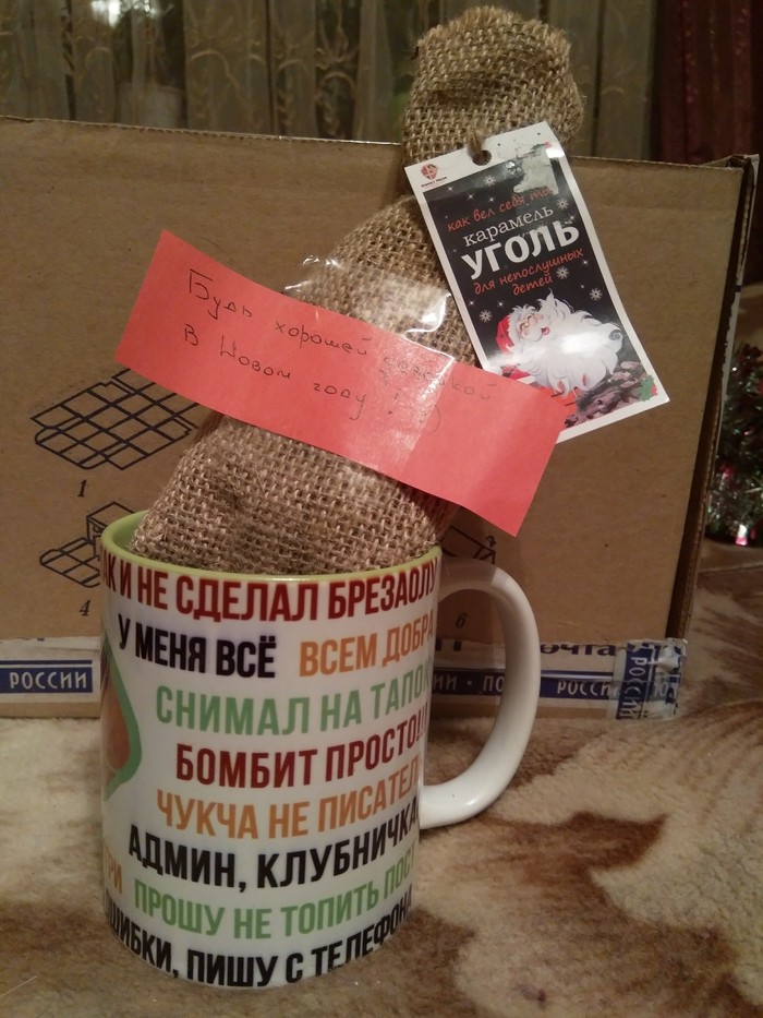 В мега крутой кружке, правда был не уголь, а собачка😁