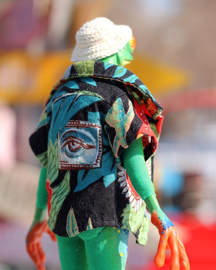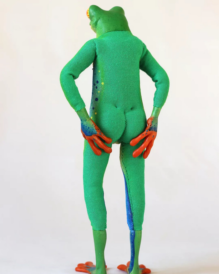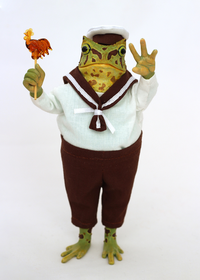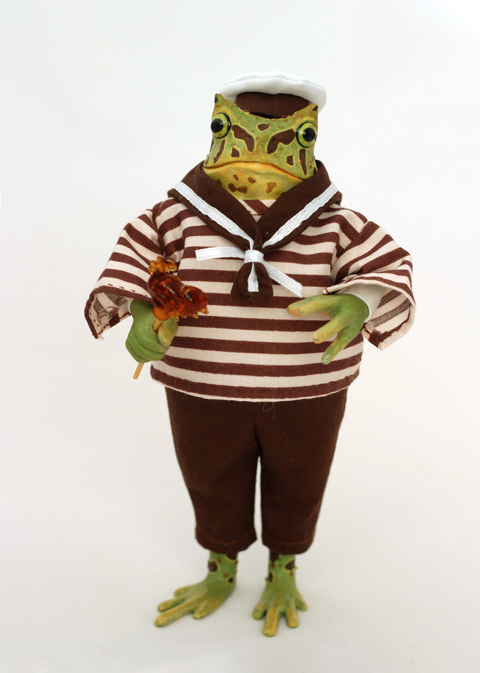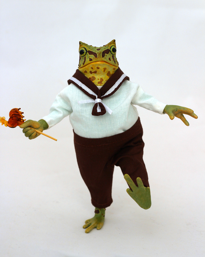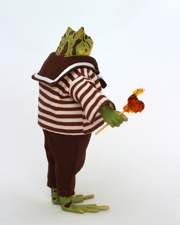 Голова и конечности сделаны из полимерной глины, расписаны акрилом. Вся одежда, кроме белой рубашки, съёмная; леденец и глазки стеклянные, леденец вынимается из руки. Шапочка держится на магнитах (один в шапочке, другой в голове). Внутри куклы подвижный проволочный каркас, жабёныш может принимать разные позы и стоять без подставки.