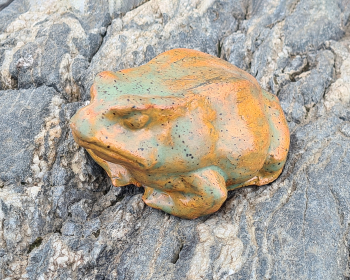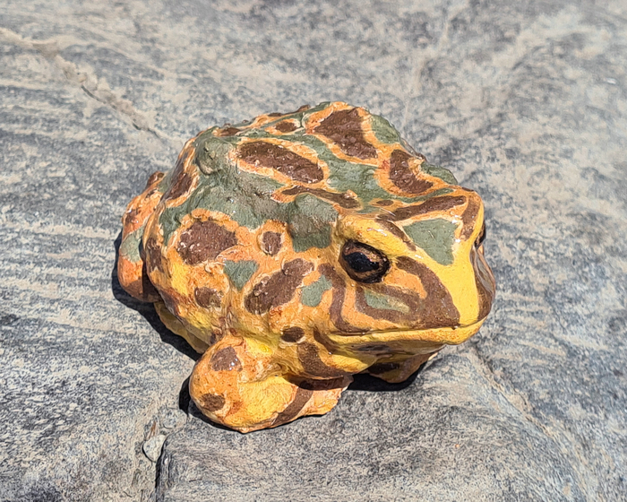 Эта жаба покрыта ангобом — это шликер (жидкая глина), смешанный с пигментом. Ангоб наносится на сырую работу перед первым обжигом. Неокрашенные пятна я планировала позже покрыть эмалями, но, боюсь, теперь до этого вряд ли дойдут руки.
