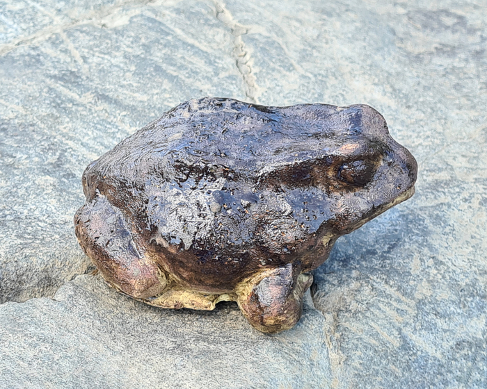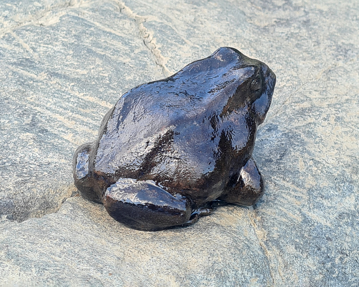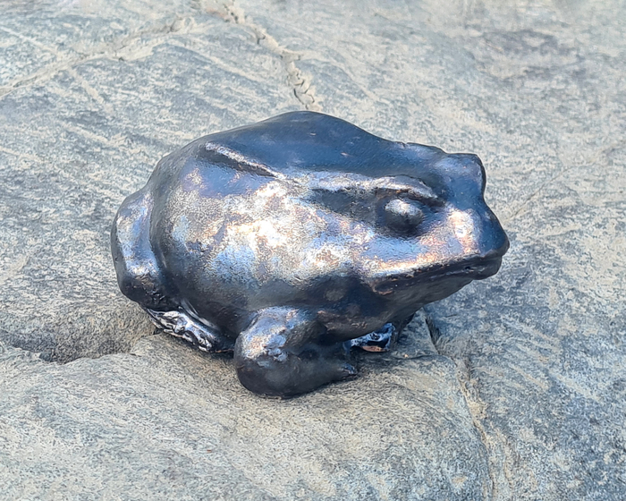 А это пример того, как по-разному может вести себя глазурь в зависимости от условий. Не знаю, что конкретно на это повлияло, недостаточная толщина слоя или температура обжига, но металлический эффект глазури проявился только на первой из трёх жаб.
