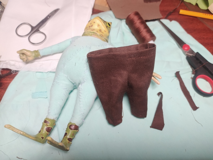 Должна признаться: я не умею шить. Не знаю, в какой момент я свернула не туда и пришла от простых меховых тушек к антропоморфным жабам, требующим детализированного аутфита. Я даже в детстве на барби не шила - мой максимум был взять кусок ткани и порезать там пару отверстий для рук. Всё осложняется тем, что я не шью на машинке. Как-то у меня с ними ещё со школы не заладилось (ну вы знаете эти школьные машинки, когда проще сшить вручную, чем разобраться, как туда нитки вставлять). В общем, я трачу на кукольную одежду кучу сил и времени, иногда не могу заставить себя сделать последние несколько швов и кукла месяцами лежит уже почти-почти доделанная. Этот жабёныш задумывался максимально простым малышом с несъёмной одеждой, ограничивающейся штанами и рубашкой, а в итоге у него получился самый объёмный гардероб из всех моих жаб. Ну разве можно было оставить беднягу в такой мороз без шубки?