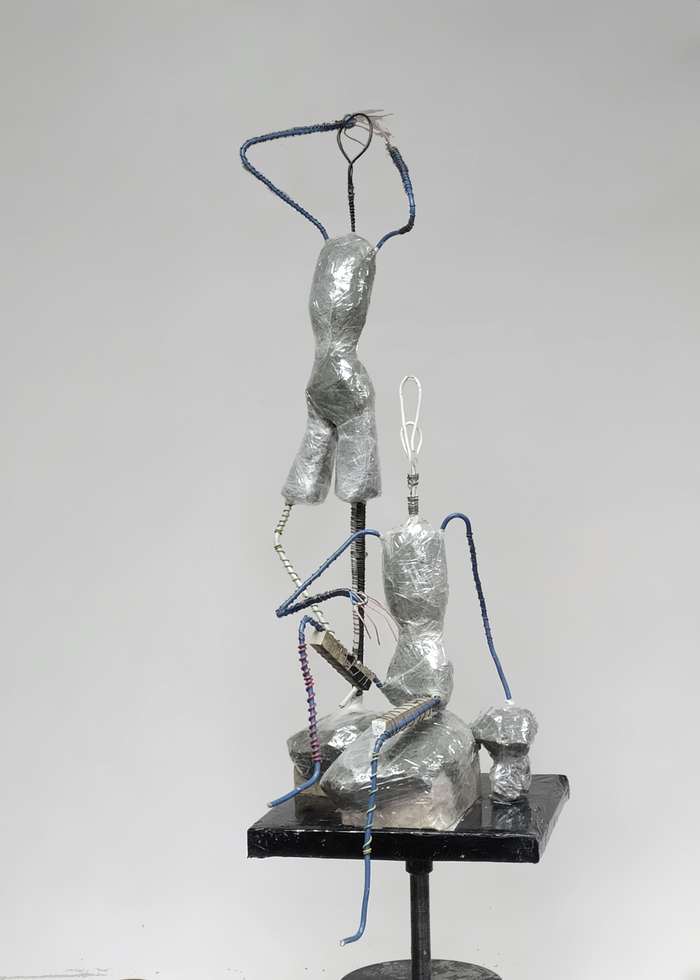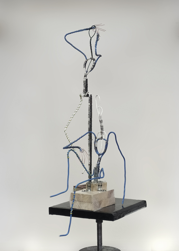 Несколько промежуточных фото. Сначала каркас. Каркасы на фигуры сделаны из толстого алюминиевого кабеля, скручены стальной вязальной проволокой. Стоячая фигура закреплена на опоре, сваренной из стального профиля квадратного сечения. Сидячая фигура прикручена к уголку.