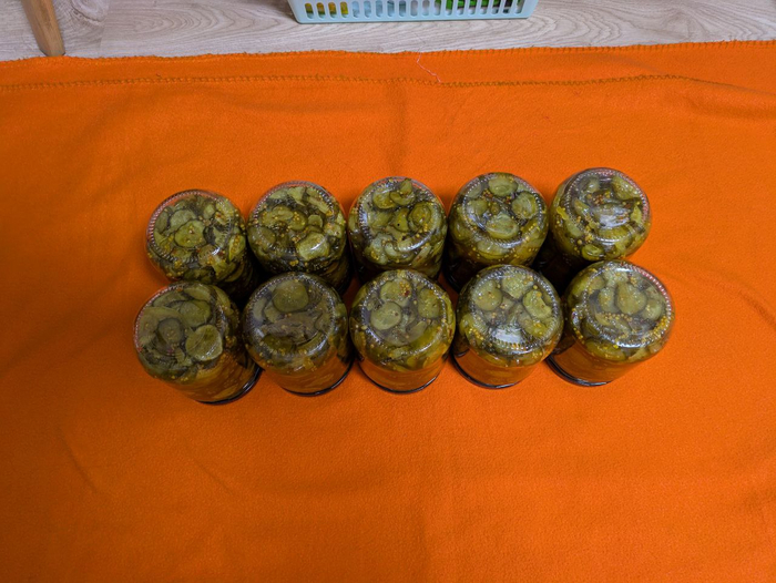 Такие вот дела. Из 7 кг огурцов и 1.5 кг лука получилось 10 банок по 0.5. Соль высасывает соки из сырья и получается такая вот усадка продукта. Но оно того стоит, повторюсь.