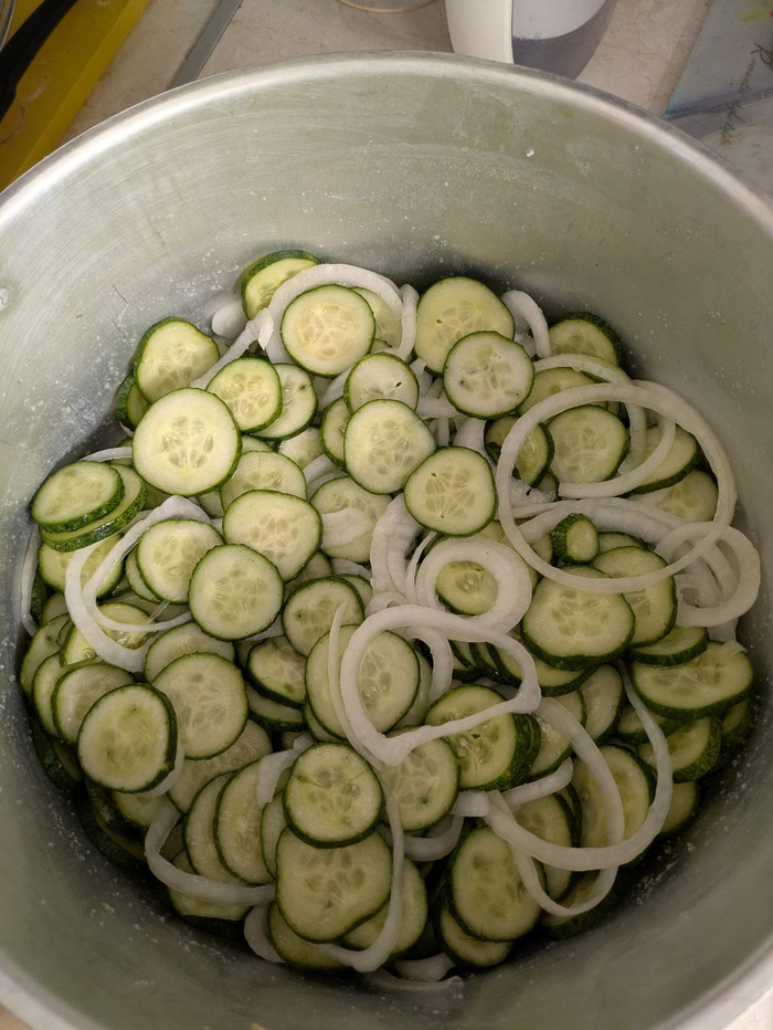 Штош, начнём. Огурецы и лук нарезаем тонкими кольцами, где-то по полсантиметра. У меня для этого есть слайсер, я им и халапенисы нарезаю, но если есть только нож, то придется чутка повозиться.